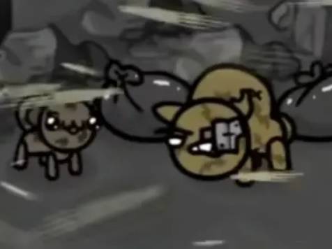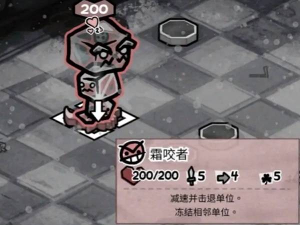 没有眼睛所以它们索敌很差,经常找不到猫空挥打队友。最主要机制是受到伤害吐痰,大的直线吐痰,小的往正面向前第三格吐痰,注意这个反击机制你就知道怎么打了。一个难达成但很好玩的打法是把它们调整到面对面差两格,然后你打下其中一个就可以见证吐痰永动机了。