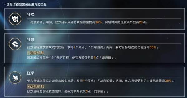 「战意汹涌」期间,敌方目标受到的欢愉伤害提高30%,阿哈时刻的速度额外提高20点。