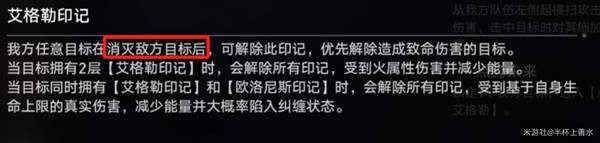 这个怪物主要的核心就是【艾格勒印记】,两层叠加后会受到火伤同时减少能量,这个印记没办法通过净化能力解除,只有该印记没办法通过【净化】能力解除,只能通过消灭敌方的方式解除,由于【降示黎明】释放之后会召唤小怪,可以通过群伤消灭召唤的【流星铁鹰】来解除印记;