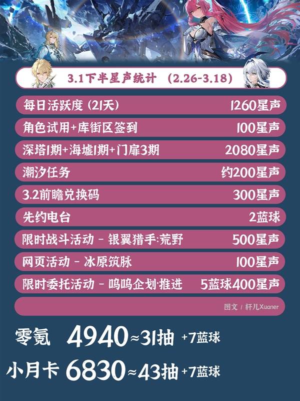 注意:星声统计请以实际游戏内获得数量为准,下半应该多一些成就的星声,一起算在上半了,记得上线领取1600星声哦~