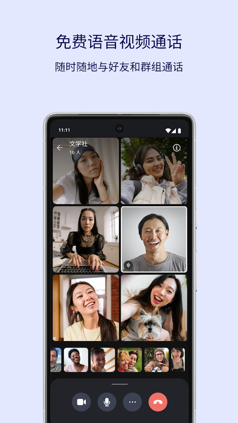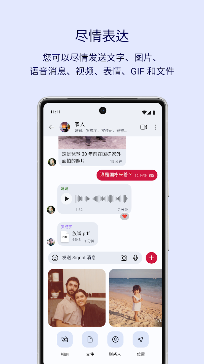 除了文字消息,用户还可以免费发送语音消息、图片、视频、GIF 文件和文档,还可以拨打加密的语音和视频通话。