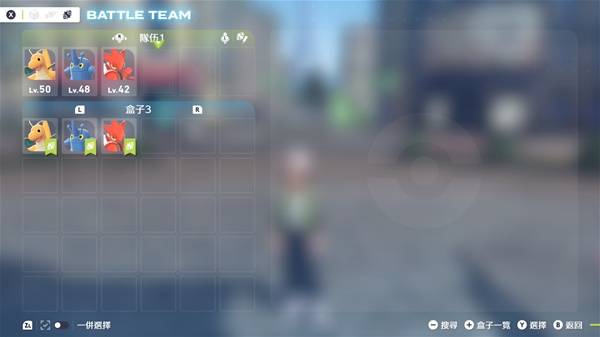 首先是登录对战队伍。在已经打开主选单的「盒子」的状态下按下2次X键,队伍就会从「同行」切换至「对战队伍」。从盒子选择要参加级别对战的3只宝可梦,组成1支队伍。由于同行的宝可梦无法加入对战队伍,请事先将要登录的宝可梦放进盒子里。