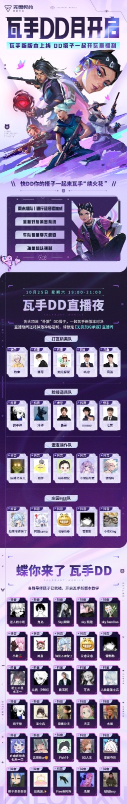 除了丰富多彩的运营活动外,10月25日晚间,“瓦手DD夜”直播活动也将同步来袭,牧童、鸽子神等来自各大平台的头部主播,届时将会同台竞技打响幕蝶vs黑梦的PK直播,为玩家们献上精彩对决时刻,更有海量惊喜福利送不停!更多信息请关注《无畏契约手游》官方咨询。